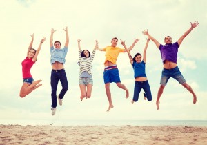 summer, holidays, vacation, happy people concept – group of friends jumping on the beach